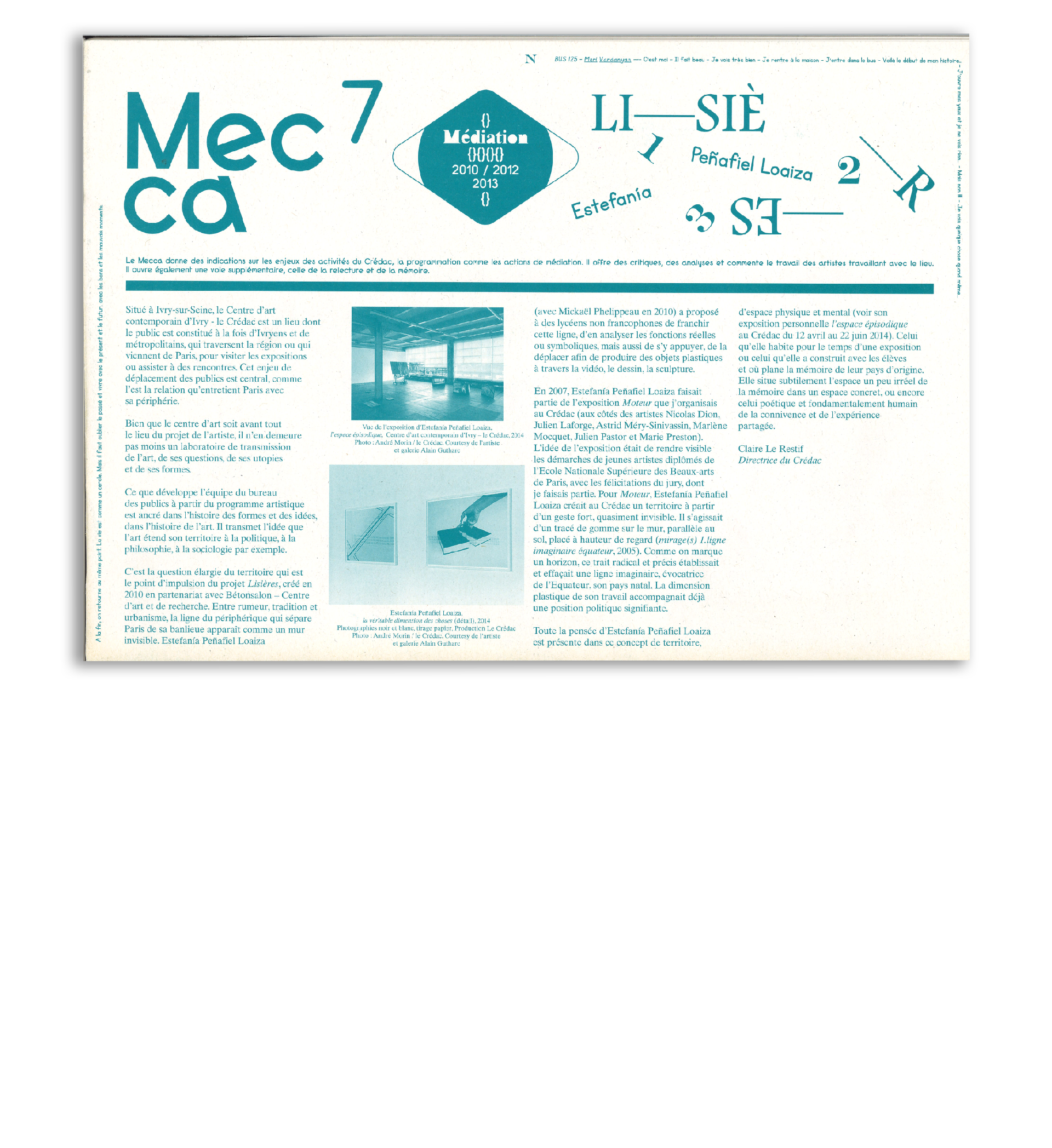 Estefanía Peñafiel Loaiza construit son œuvre sur la tension entre le visible et l’invisible. Invitée à exposer en 2007 au Crédac, l’artiste avait produit une œuvre presque imperceptible, un long trait de gomme tracé sur le mur à hauteur de regard et parallèle au sol (mirages(s) 2. ligne imaginaire, équateur). Comme on marque un horizon, cette ligne à la fois radicale et précise évoque la ligne imaginaire de l’Équateur, son pays natal.