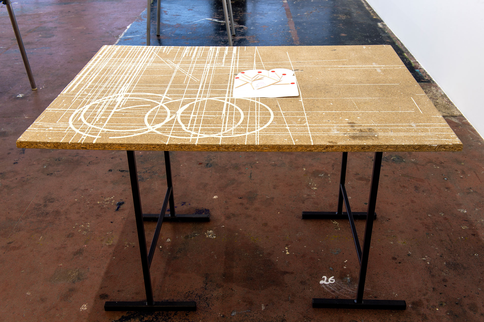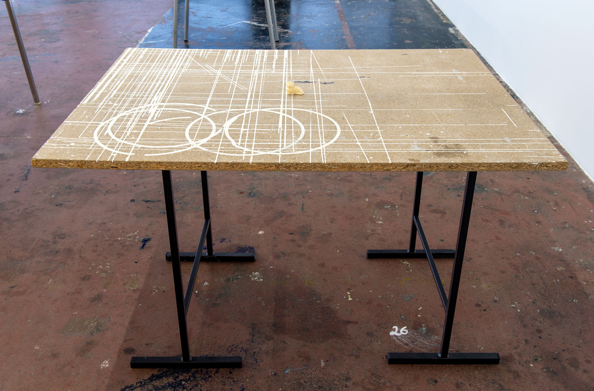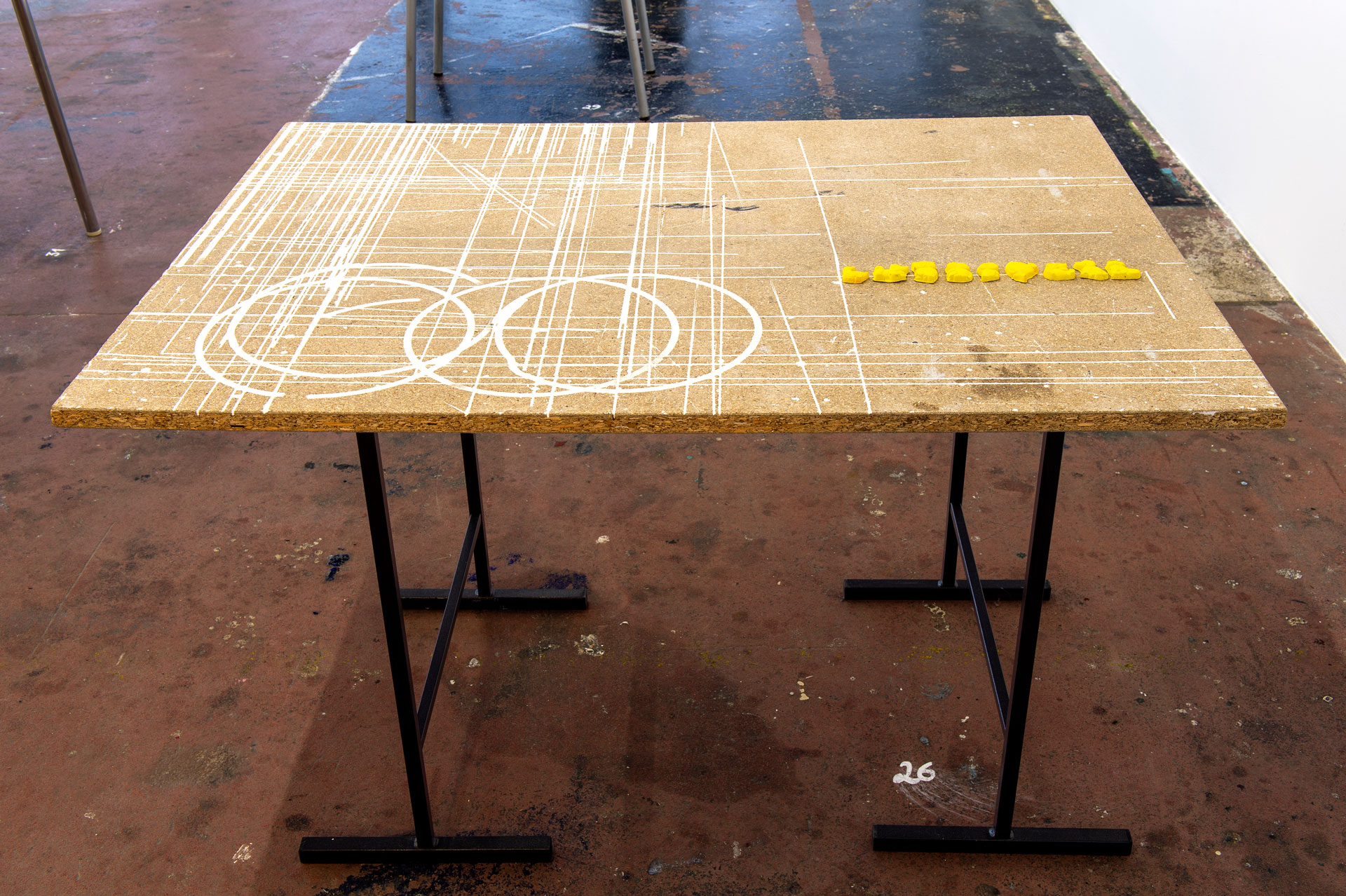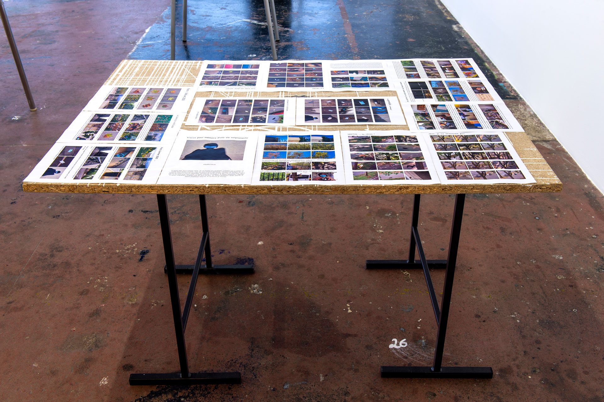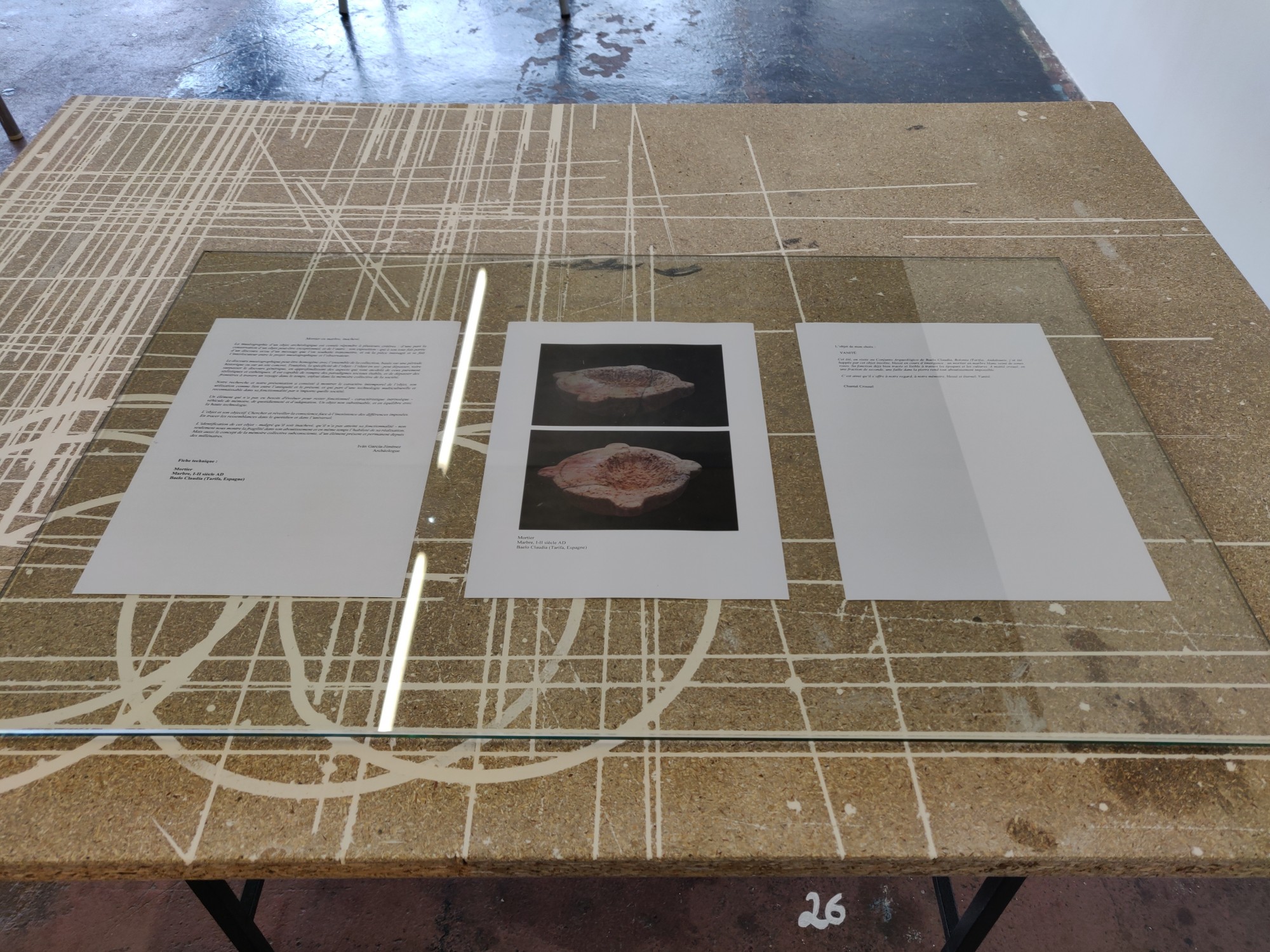 Située à mi-parcours de l’exposition, la table n°26 est un fragment du plateau de l’atelier-régie, lieu de production des œuvres et des réunions du Conseil d’administration du Crédac. Un établi sur lequel se discute le projet artistique et financier du centre d’art, une table des négociations avec nos partenaires. À travers ses nombreux martyrs, une archéologie du travail se révèle.