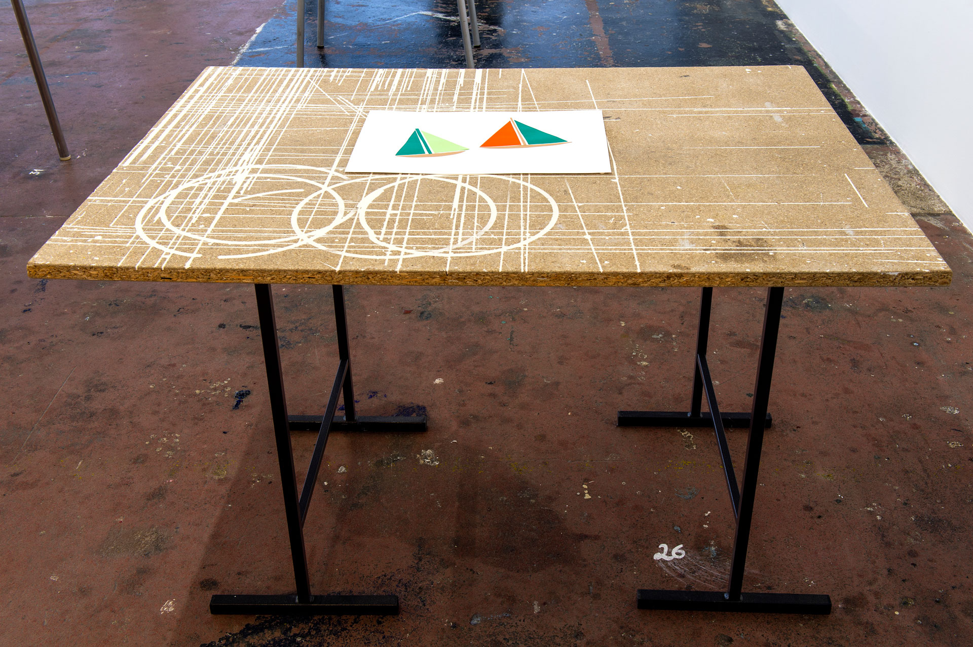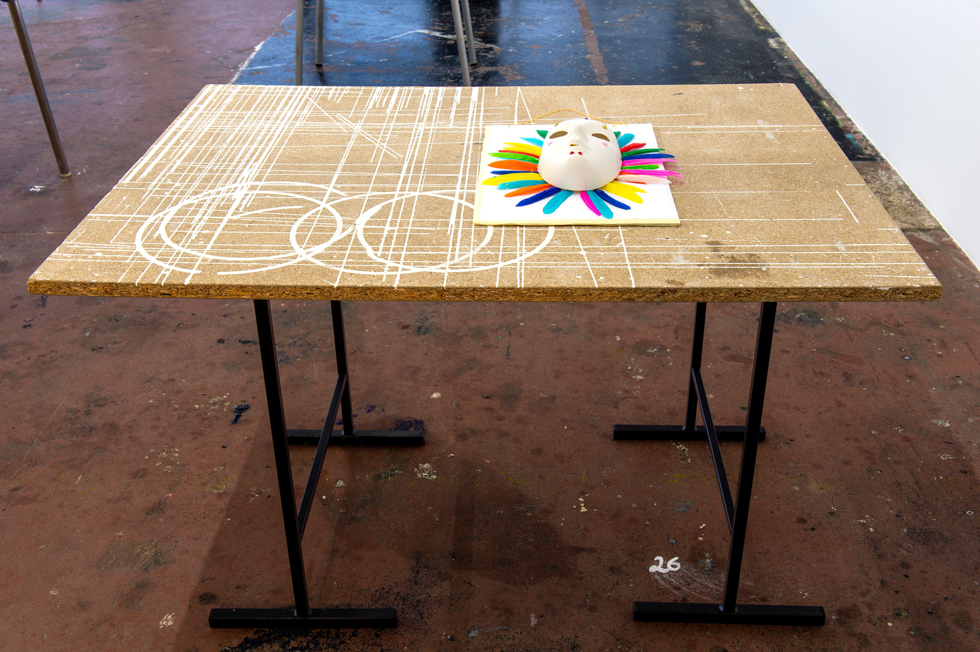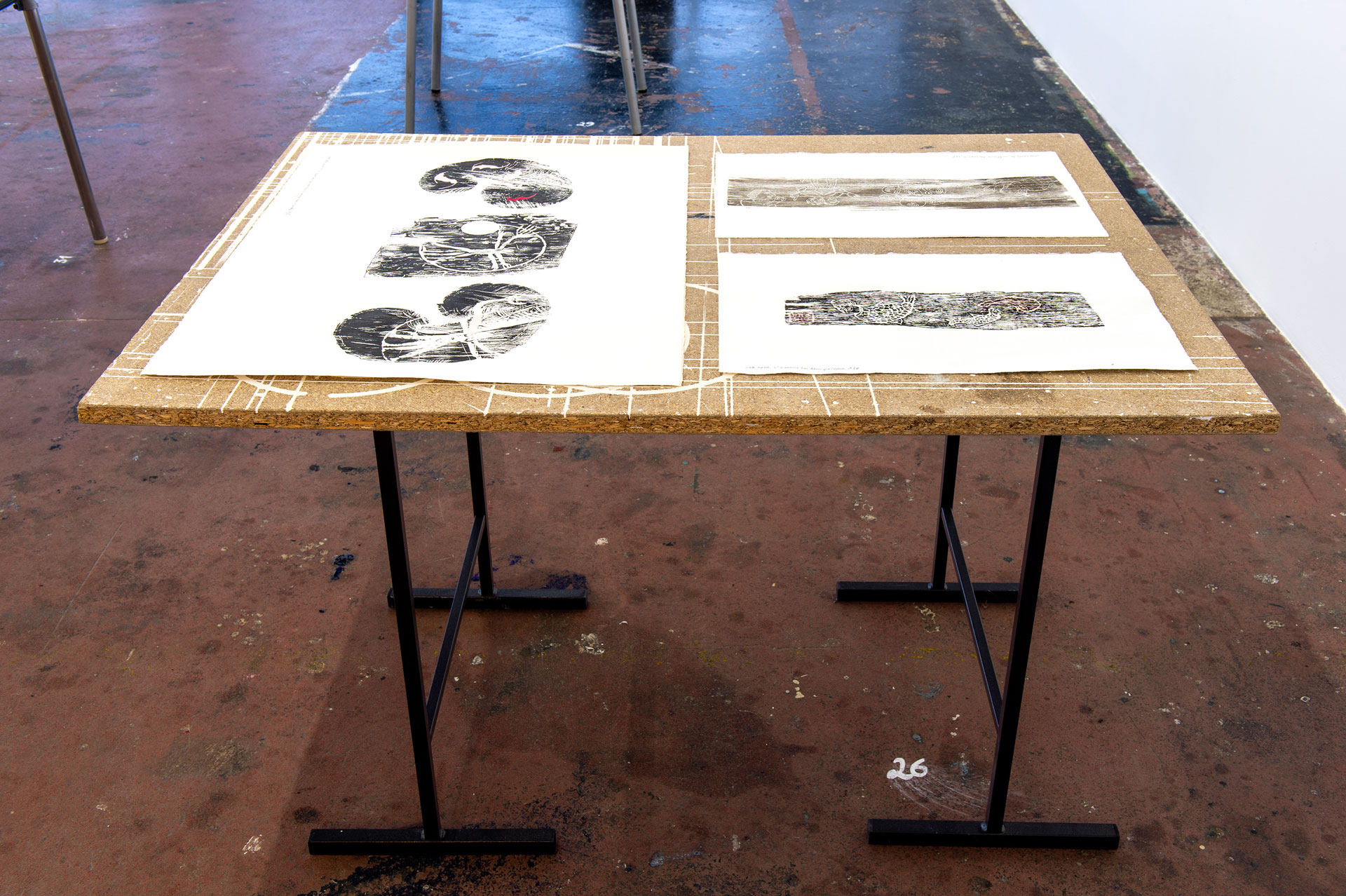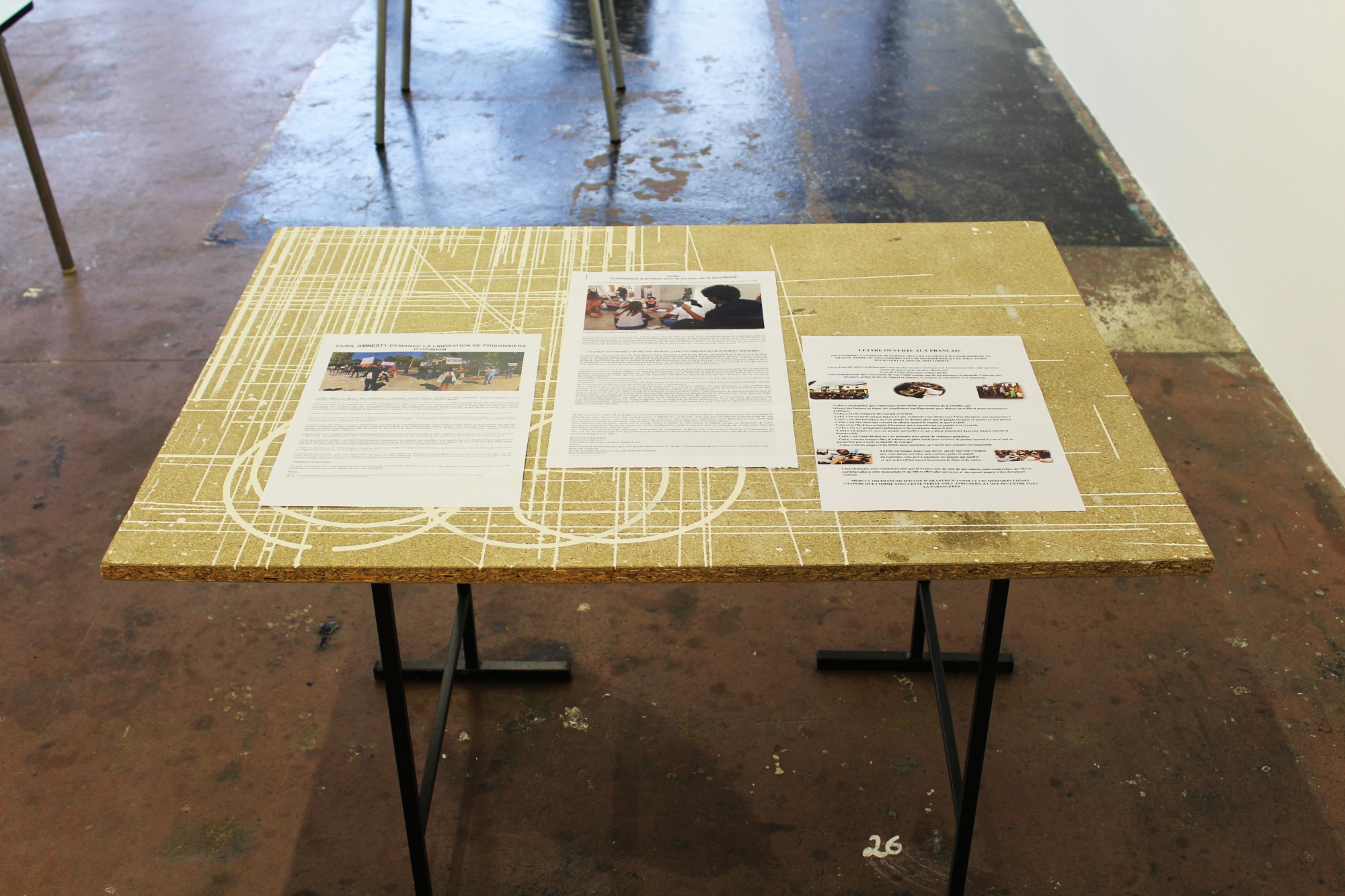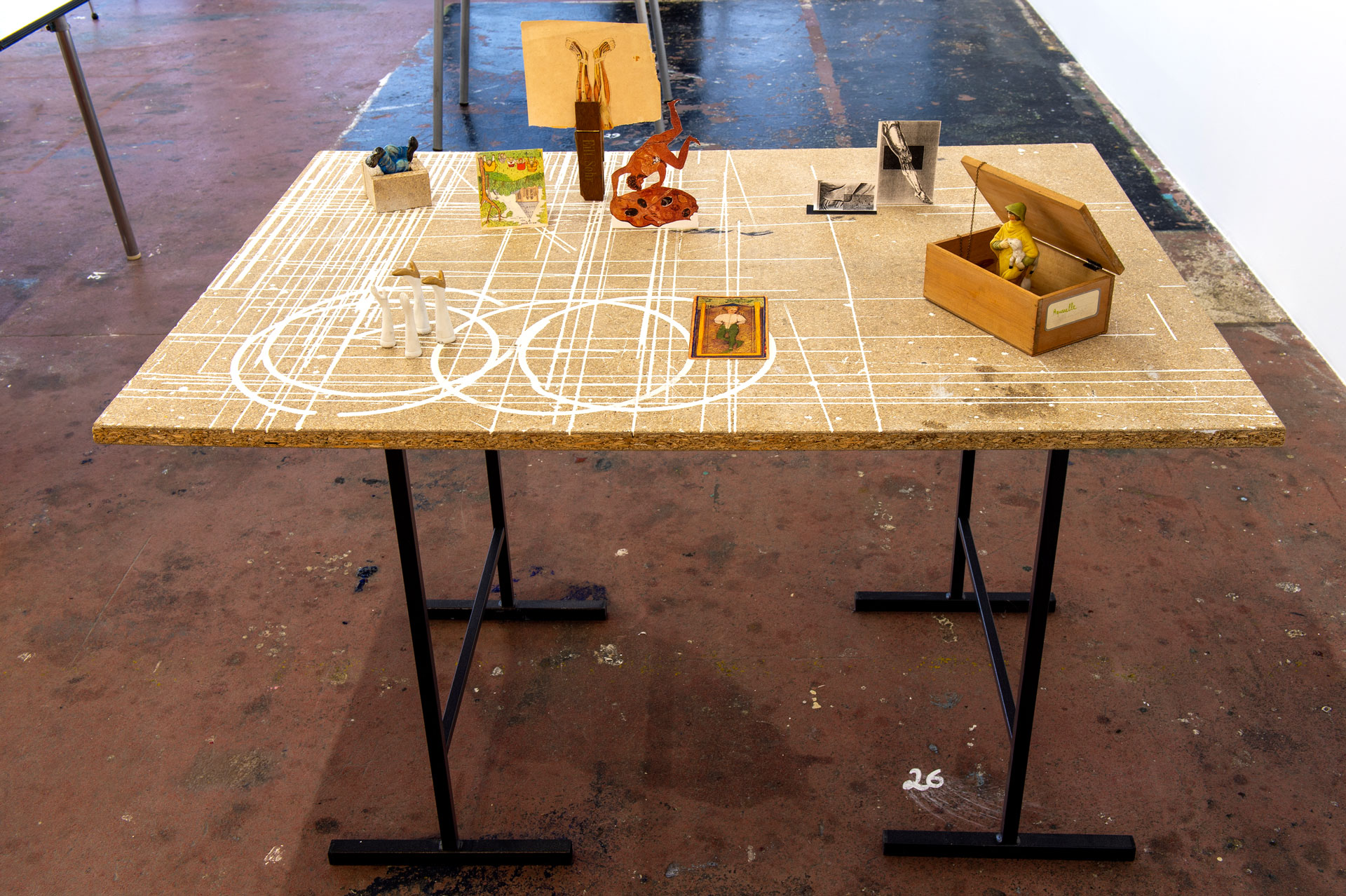 Située à mi-parcours de l’exposition, la table n°26 est un fragment du plateau de l’atelier-régie, lieu de production des œuvres et des réunions du Conseil d’administration du Crédac. Un établi sur lequel se discute le projet artistique et financier du centre d’art, une table des négociations avec nos partenaires. À travers ses nombreux martyrs, une archéologie du travail se révèle.