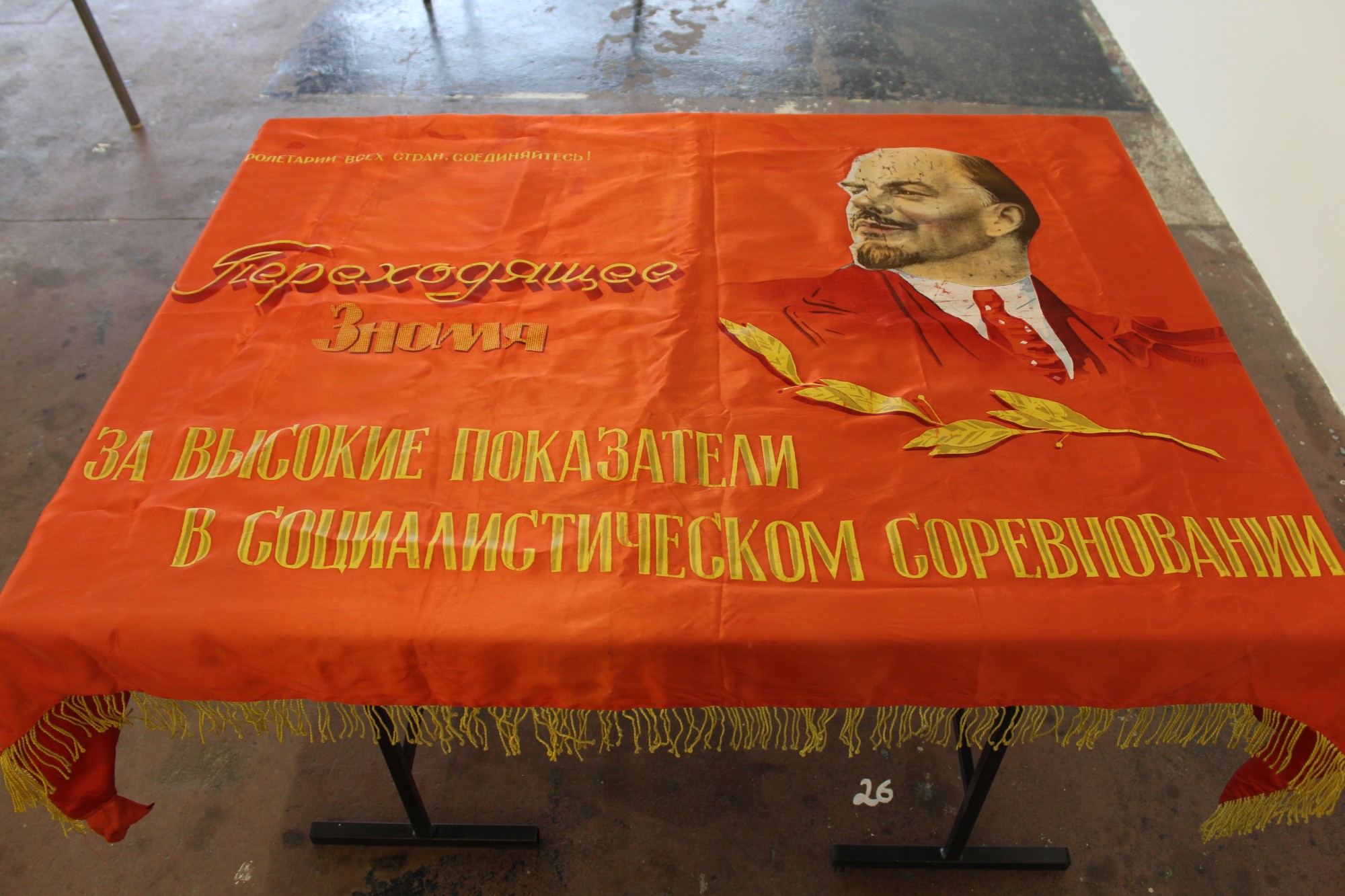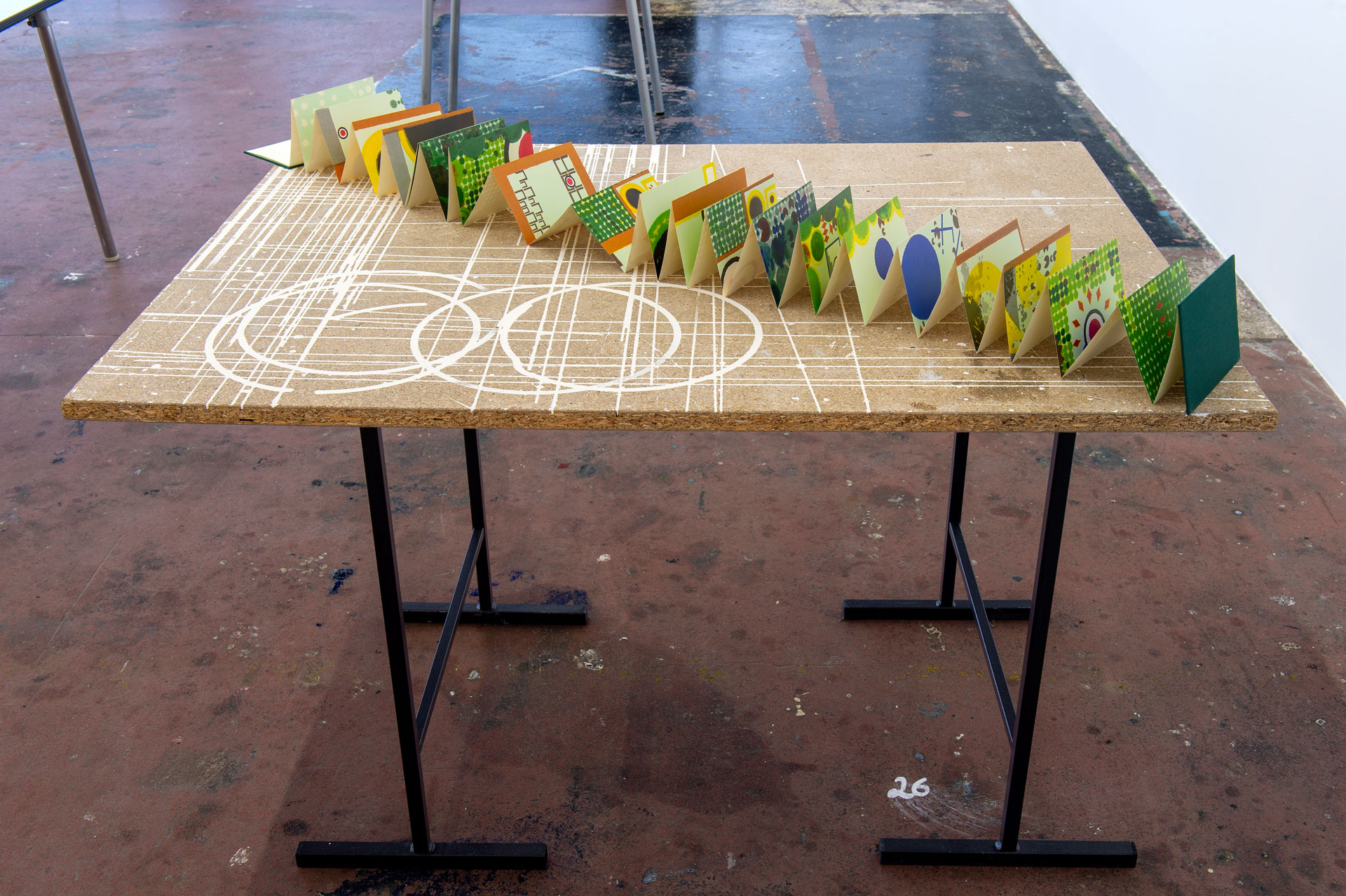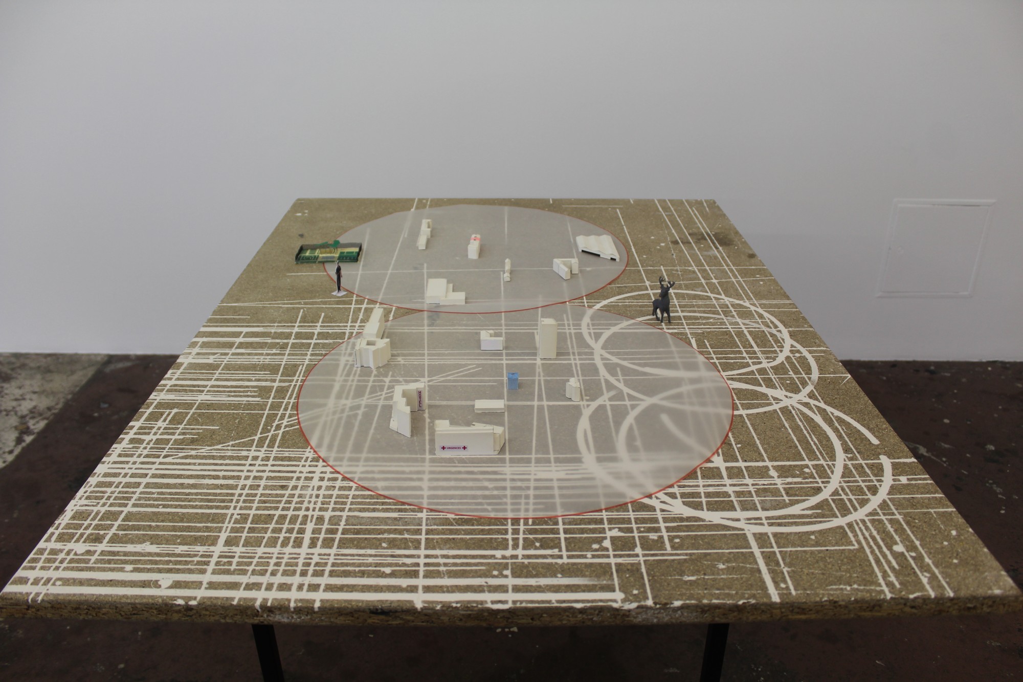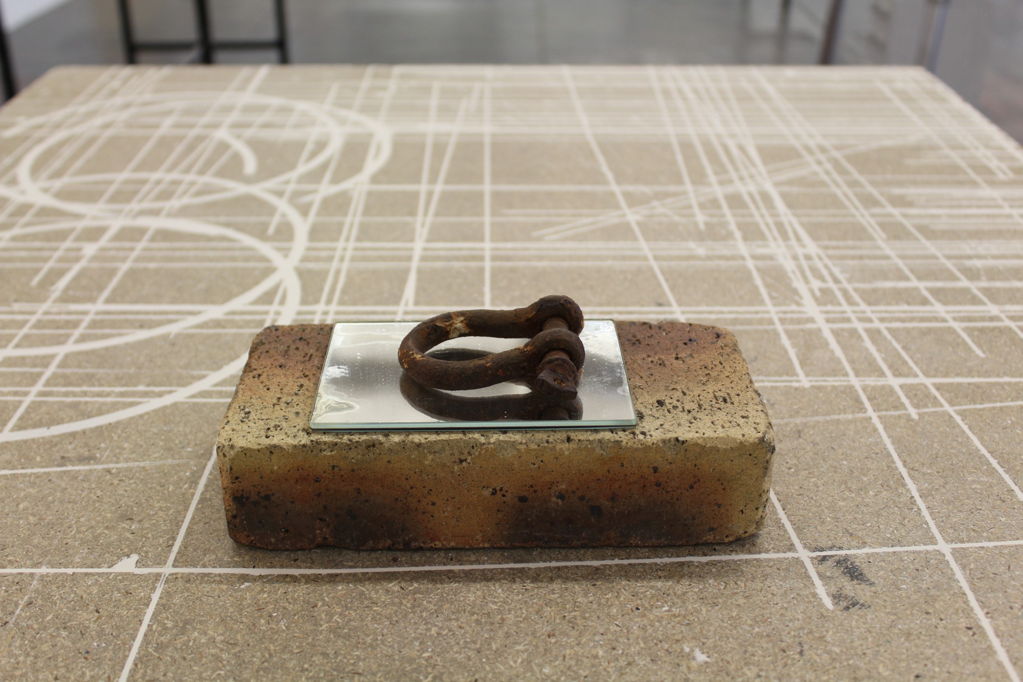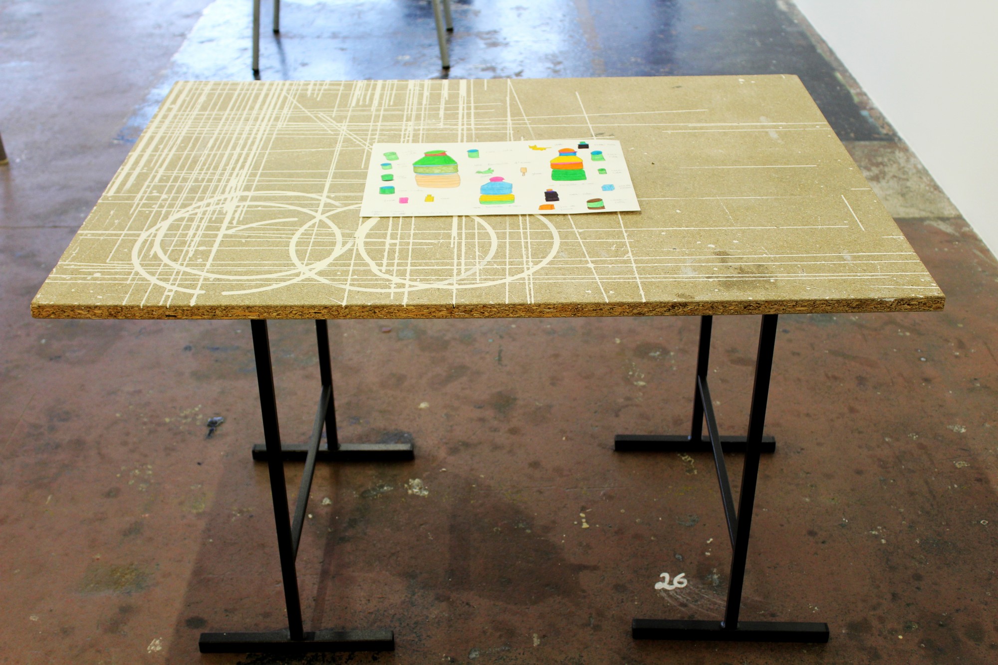 Située à mi-parcours de l’exposition, la table n°26 est un fragment du plateau de l’atelier-régie, lieu de production des œuvres et des réunions du Conseil d’administration du Crédac. Un établi sur lequel se discute le projet artistique et financier du centre d’art, une table des négociations avec nos partenaires. À travers ses nombreux martyrs, une archéologie du travail se révèle.