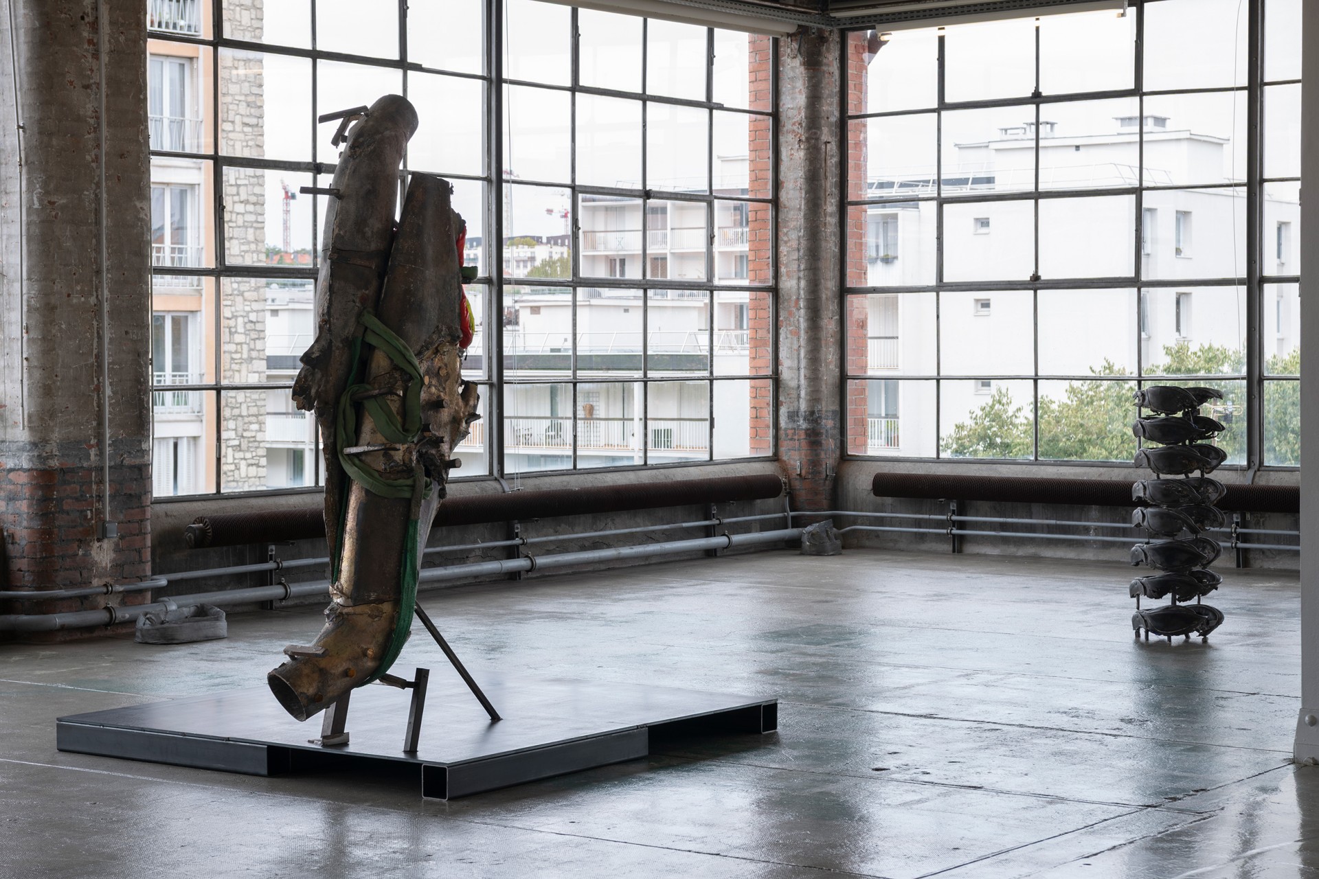Their weft, the grass, 2025. Bidons en métal, textile. Courtesy de l’artiste. © le Crédac - photo : Marc Domage