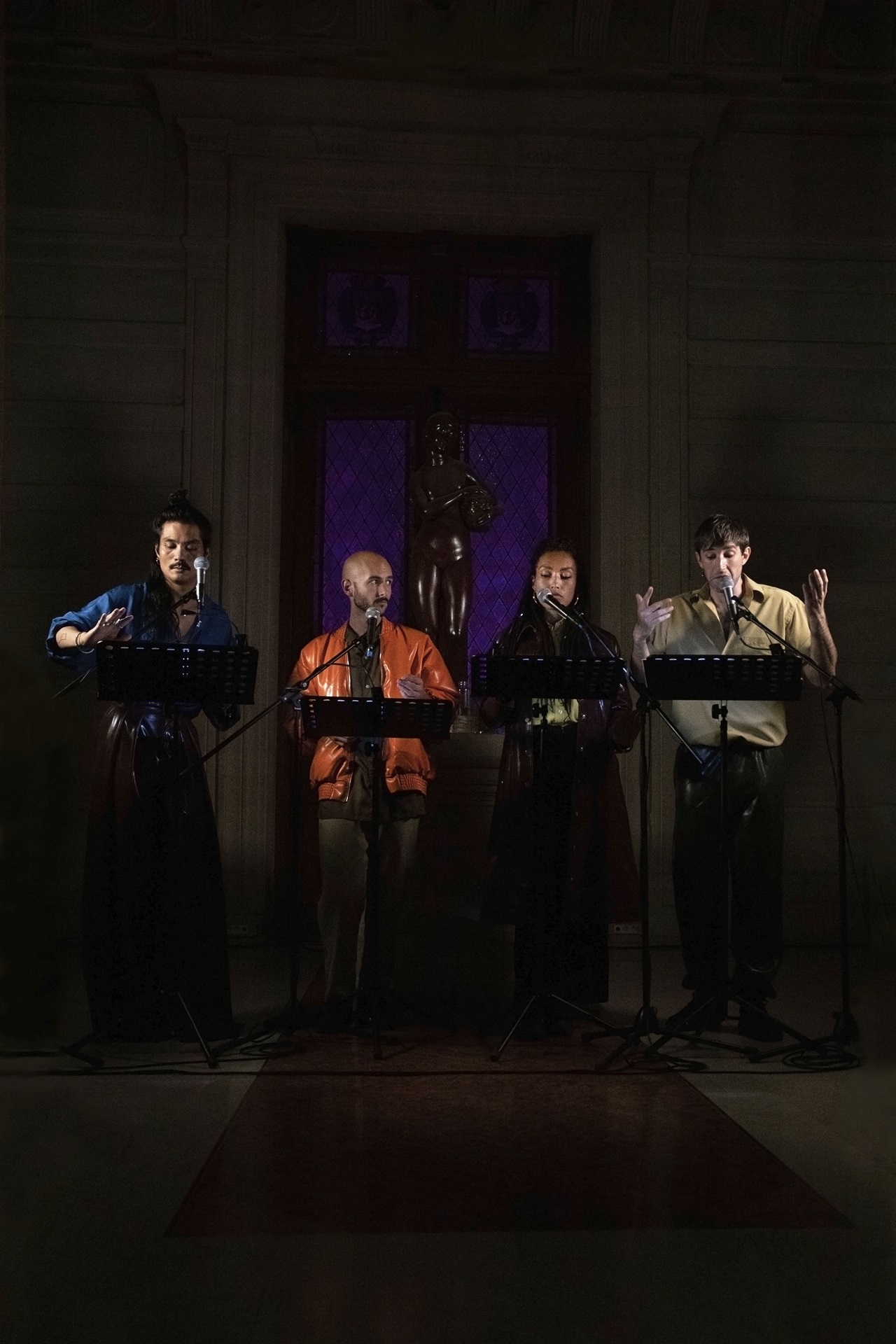 Tripple Dribble, exposition personnelle de Julia Borderie avec la collaboration de Simon Zaborski, Sculptures conçues en collaboration avec les joueurs·es de l’Union Sportive d’Ivry et de l’Entente Sportive de Vitry. Acier inox, tissu. Couture : Lou Thonne. Courtesy des artistes. © Julia Borderie / Adagp, Paris, 2024. Photo : Marc Domage / le Crédac, 2024